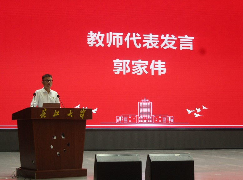 在庄严的国歌声中,开学典礼拉开了序幕。yl7703永利集团教师代表郭家伟教授登台发言,对新同学们的到来表示热烈的欢迎和诚挚的祝贺,勉励新生们要走出高考“后遗症”,尽快适应新环境,爱上读书做学问,牢牢扎根在yl7703永利集团这片沃土,厚积薄发,让青春在校园里绽放光华。