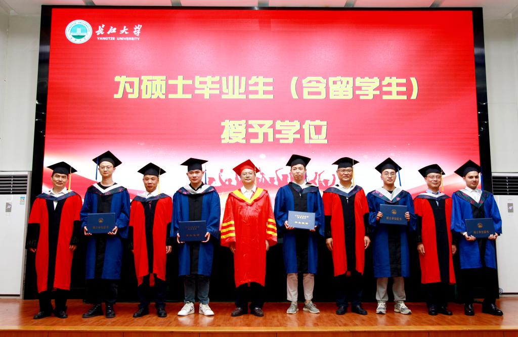 毕业典礼结束后,学位授予仪式正式开始。身穿学士服、头戴学士帽的硕士毕业生、本科毕业生依次走上主席台,由毛精华、龚权、李茂坤、汤绍迁、梅京松五位教授为所有毕业生正冠拨穗、颁发学位证书并合影留念。