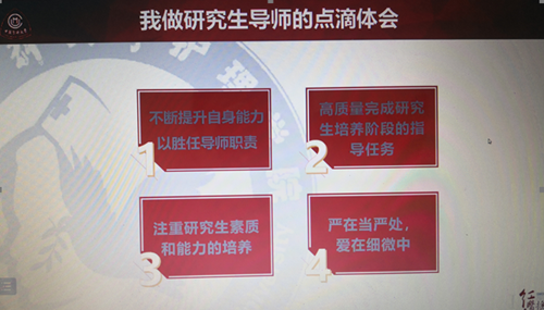 李小寒教授介绍了我国护理学硕士研究生教育的概况,从“不断提升自身能力以胜任导师职责”“高质量完成研究生培养阶段的指导任务”“注重研究生素质和能力的培养”“严在当严处、爱在细微中”四个方面分享了其几十年护理博士、硕士研究生导师的心得体会,重点介绍了不同培养阶段研究生导师的指导任务和指导方法。