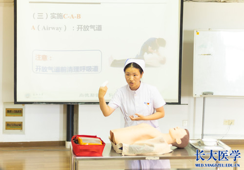 在心肺复苏的分组实操现场,邓老师借助模拟人演示了正确的心肺按压和人工呼吸方式。护理系志愿者在实践课程中热心为学员实际操作解疑答惑,使参加培训的学员较为系统地掌握了心肺复苏现场紧急救援知识和正确处理方法,为应对紧急病患赢得“黄金”救援4分钟时间奠定了良好的急救基础,进一步提升了学员紧急救护的能力。