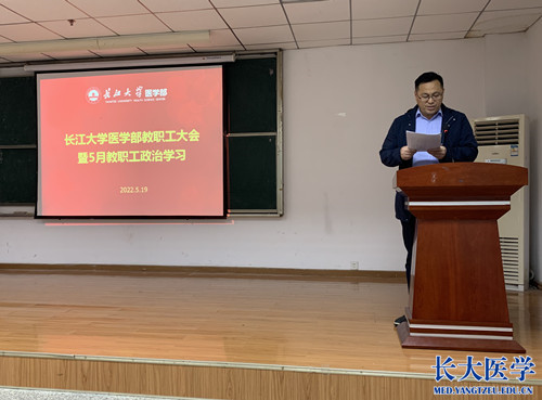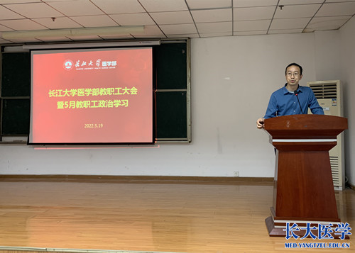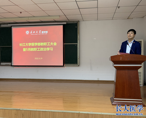 党委副书记张文君传达《中共yl7703永利集团委员会关于推进“清廉杏林”建设实施方案》(长大医发〔2022〕3号)文件精神,并从总体目标、主要任务、组织与保障三个方面说明实施方案的具体内容。