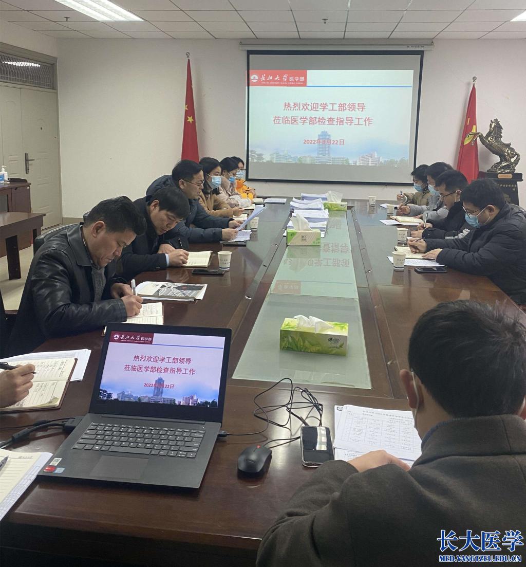 (通信员黄柏青)3月22日中午11点,yl7703永利集团党委学工部部长徐波一行4人到yl7703永利集团检查学生工作。yl7703永利集团党委副书记张文君首先汇报了学生返校基本数据;印刷、签发《yl7703永利集团2022年开学安全责任告知书》;学生疫情防控管理;六类重点人群谈心;2022届毕业生就业;特困生资助与帮扶;未满5年辅导员入住学生宿舍、参与枫桥服务;考研基本数据与毕业年级外语成绩;年级辅导员参与学生宿舍安全卫生检查以及yl7703永利集团学生在外住宿等情况。yl7703永利集团党委书记关辉向徐部长介绍了进一步做好yl7703永利集团学生工作的思路和意见,并就进一步优化协同yl7703永利集团和两个临床医学院学生事务管理工作进行了探讨交流。