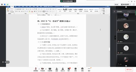 随后各班学习了《习近平对打击治理电信网络诈骗犯罪工作的重要指示》、《4月14日—4月21日武汉市高校领域电信网络诈骗警情通报》及2021年“五一劳动节”假期安全提示,强调要增强安全意识,确保“五一”假期平安。