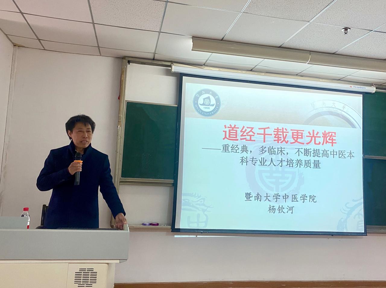 讲座伊始,杨钦河教授点明主旨“重经典,多临床,不断提高中医本科专业人才培养质量”是中医学人孜孜不倦的追求,而后就此展开详细阐述与拓展。“学经典必须精读精背,学经典必须经常结合实际”,杨钦河教授对“重经典”提出以上两点要求,并总结在这次新冠疫情中,中医如何大放异彩,为学生指明未来中医专业发展的明亮前景。接下来,杨钦河教授与大家分享了暨南大学中医学专业发展的优秀成果、人才培养方案、经典学习、经典考级等具体做法与实践经验,为我部中西医临床专业发展提供新的思路。
