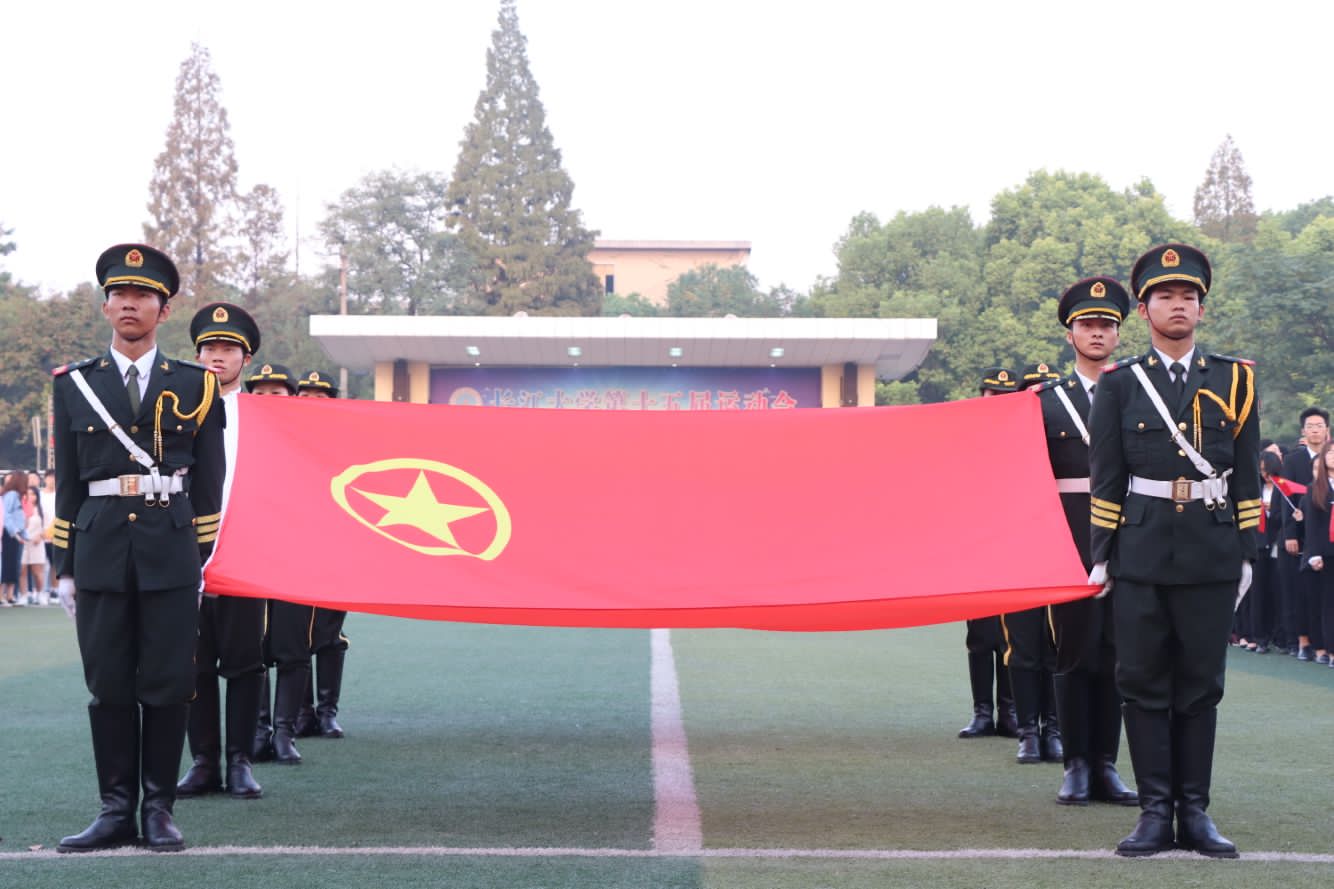 首先,英姿飒爽的国旗护卫队队员们护送鲜艳的五星红旗进场。行礼完毕,伴随着激昂雄壮的国歌声,五星红旗冉冉升起,迎风飘扬,全体师生肃立注目,深怀对祖国无限的热爱和崇高的敬意。