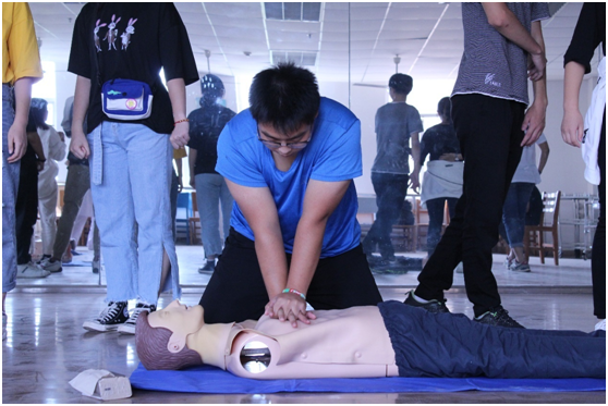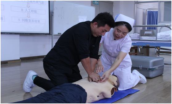 教师讲解示范后,同学们在两位专业老师的指导下分组进行了创伤救护和心肺复苏的操作训练,并对所有学员进行了技能考核,巩固了所学的知识与技能。
