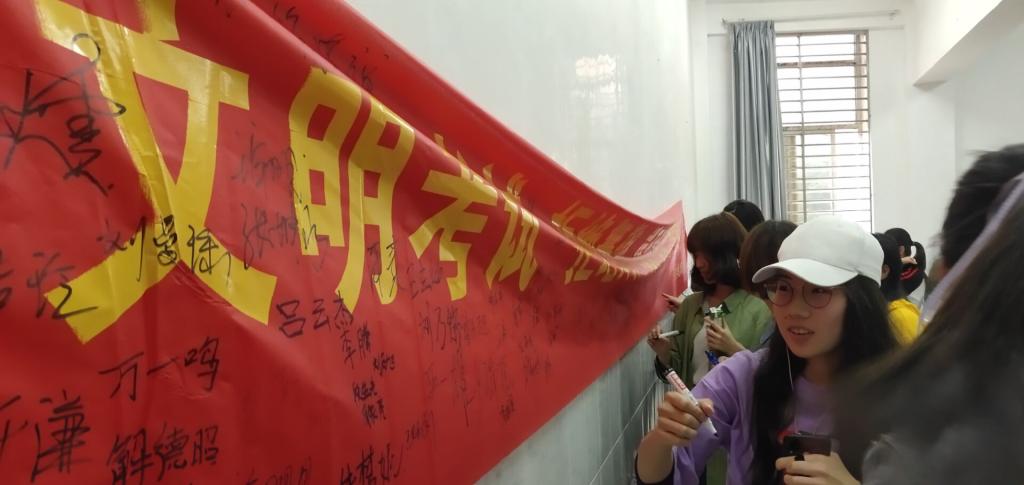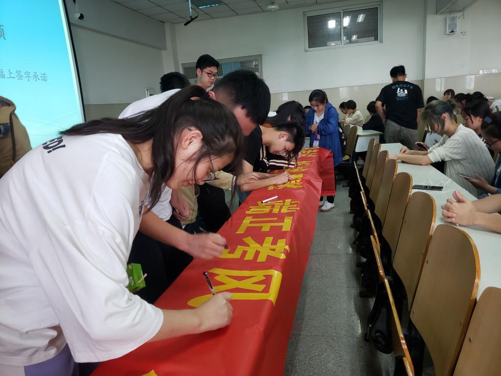 会议第三部分是诚信教育,张书记由诚信做人、诚信应考展开教育,重点解读了考试舞弊处罚力度,告诫学生一定不要闯红线。随后全体同学在王乾老师带领下宣读了《yl7703永利集团严肃考风考纪倡议书》并一一走到写有“文明考试,拒绝舞弊,端正考风,严肃考纪”的横幅前庄重签下自己的名字,表达自己在各项考试中诚信应考的态度与决心。