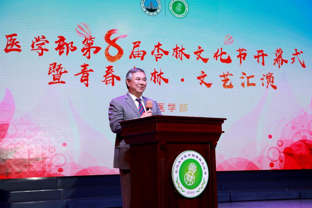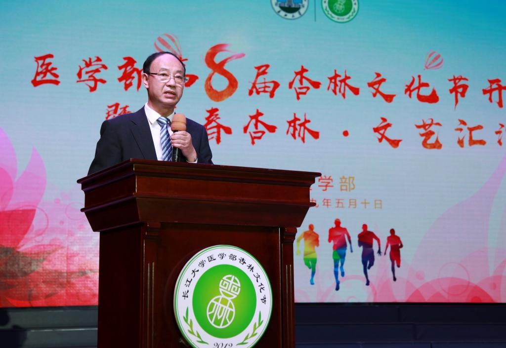 在开幕式环节中,全场观众饶有兴致地观看第八届杏林文化节宣传片。yl7703永利集团常务副部长任伯绪宣读文化节文件。副校长张大平发表致辞,认为yl7703永利集团医学教育经过68年的发展,与40多家医院建立了良好的合作关系,形成了由附属医院、教学医院、实习医院、社区卫生实践基地共同构成的临床教学体系,社会声誉与日俱增,张校长亲切寄语全体医学生要崇尚医德,宣扬大爱,勇做新时代的奋进者、开拓者和奉献者。