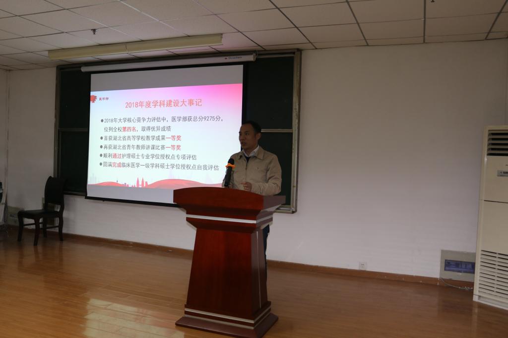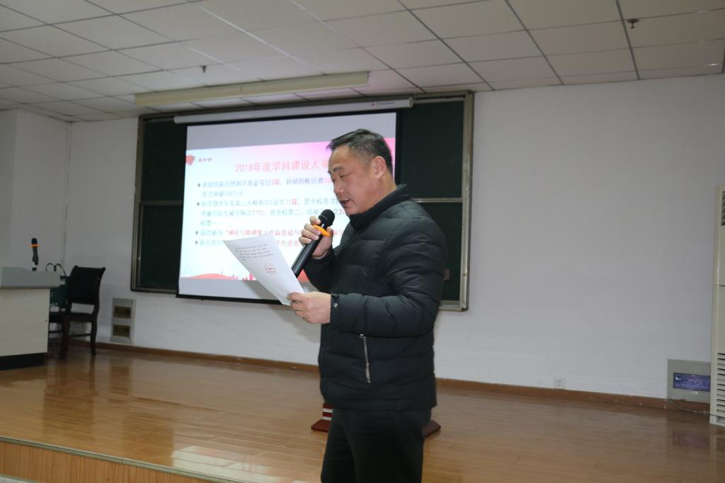 会议第一阶段,20名45岁以下博士学位教师进行科研工作述职,每位博士就2018年所开展的科研工作、取得的科研成果、未来的科研方向向全体教职工进行了汇报,在海外进修的马兆武、刘珍珍博士也通过视频进行了汇报,全体教职工对博士们2018年科研工作进行了评定,最终习志江、杨辉、刘莲三位博士被评为优秀。会议第二阶段,yl7703永利集团常务副部长任伯绪教授作yl7703永利集团2018年学科建设工作总及2019年度工作计划报告,他在报告中总结了yl7703永利集团在2018年所取得的成绩,包括2018年yl7703永利集团首次获得湖北省教学成果一等奖、再次获湖北省青年教师讲课比赛一等奖、顺利通过护理硕士专业学位专项评估的专家现场评估、圆满完成临床医学一级学科硕士授权点的自我评估、首次成功举办“神经与精神重大疾病基础与临床研究国际学术会议”、获批国家自然科学基金项目3项。任伯绪指出,在取得成绩的同时,yl7703永利集团要清楚的认识到,学部在人才引进、高水平成果产出、本科教学质量提升上还要不懈努力。2019年,yl7703永利集团要加大人才引进力度,继续设置人才引进奖,鼓励广大教职工参与到人才引进工作中来;要对照临床医学专业认证报告中提出的问题,加大整改力度,不断提高本科教学质量;采取有效措施,提升科学研究及学科建设水平,争取临床医学ESI排名有较大提升。