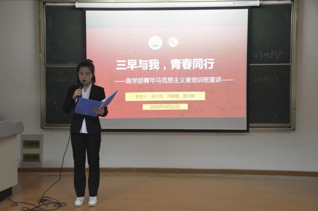 (通讯员:杨甜 潘俞彤)2019年4月21日星期日下午7点,yl7703永利集团在14教410顺利召开青年马克思主义者培训班关于“三早”宣讲活动,参加本次活动的有yl7703永利集团党委副书记张文君、辅导员王乾老师以及yl7703永利集团18级学生。
