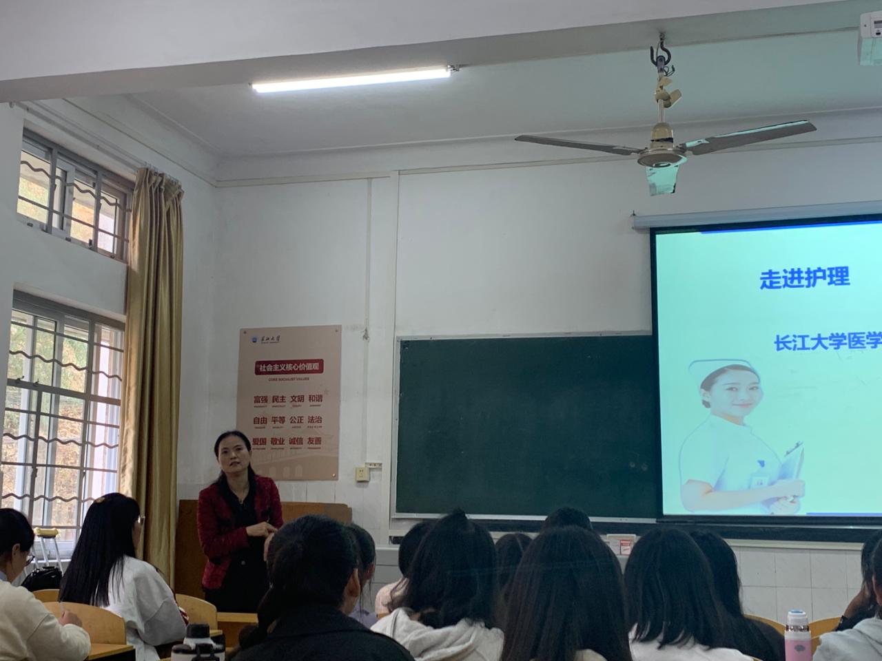 讲座伊始,周红老师从护理学的发展历史及发展前景的角度增加同学们对护理专业的认知,周老师讲述了自己与护理的缘分,让同学们懂得护理是一份崇高的职业,它是病人希望,医生的助手。接着,周老师通过讲述护理系优秀学长学姐的真实经历,让同学们了解到护理专业未来发展的光明前景。最后,周红老师以奋斗为结束词,以此激励同学们不畏困难、不断奋进。