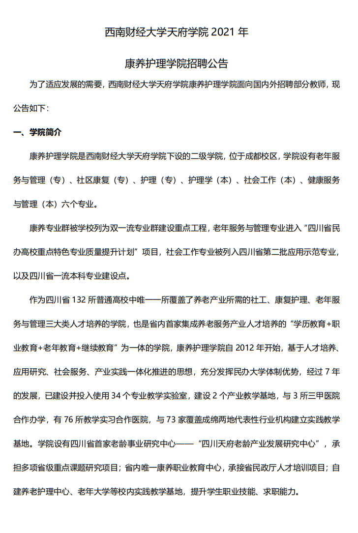 西南财经大学天府学院康养护理学院2021年教师招聘公告@20210222byCY.docx