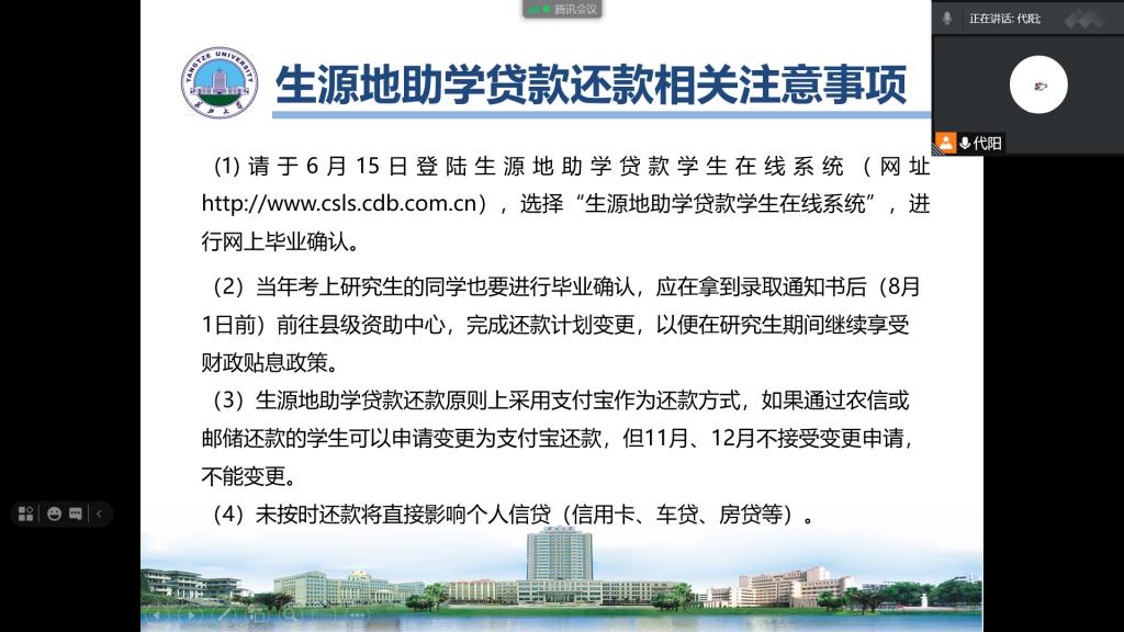 针对不同的年级,yl7703永利集团开展了侧重不同的诚信主题教育活动。18级辅导员王乾老师组织大三年级35名班干部于6月9日开展了资助育人政策专项培训工作。培训内容包括每月资助工作重点、家庭经济困难学生认定程序、各类奖助学金介绍和生源地助学贷款四个方面。通过此次培训,各班班干部对我校资助工作内容、形式和要点有了细致的了解和认知。针对办理了生源地助学贷款的63名毕业生,毕业年级辅导员代阳老师组建了毕业生贷后管理工作群,并通过腾讯会议线上讲解了毕业生还款流程、还款方式、还款时间及相关注意事项,并强调了个人信用的重要性,提醒学生务必按时按要求进行还款。