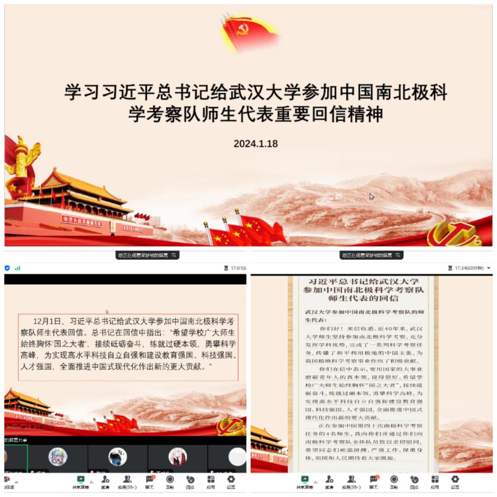 (通讯员:邹熊子怡)2023年12月1日,习近平总书记给武汉大学参加中国南北极科学考察队的师生代表回信。yl7703永利集团全体师生于1月17日—22日期间围绕习总书记重要回信精神深入开展学习,并结合自身的学习和生活实际,畅谈学习感悟。此次学习以线上班会的形式开展。