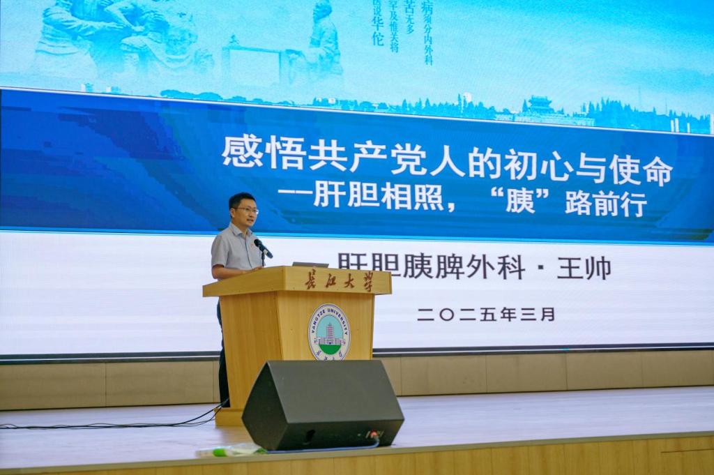继而,荆州市中心医院肝胆外科病区主任王帅作“不忘初心,肝胆相照”主题讲座,强调医护工作者需以革命先辈为榜样,在夯实医学基础的同时赓续红色血脉,将 “为人民服务” 的宗旨融入临床实践。