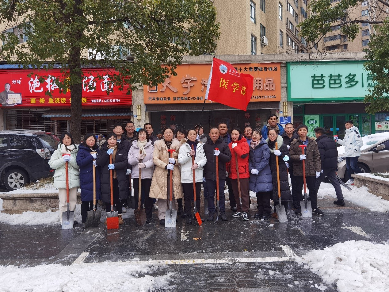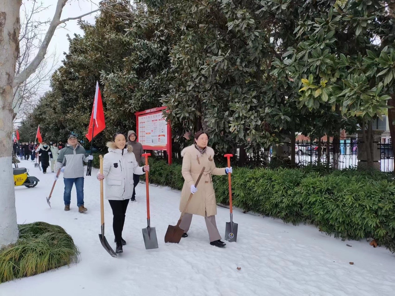 2月22日中午,为确保人民群众出行安全,yl7703永利集团党委积极响应学校号召,迅速动员组织20余名党员干部,于长江尚品小区门口至大桥十字路口和东苑小区一带开展铲雪除冰工作。