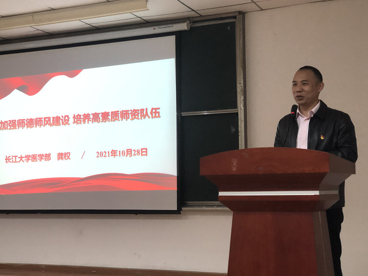 常务副部长龚权就“加强师德师风建设 培养高素质师资队伍”为主题带领全体教职工学习习近平总书记的重要讲话精神,通过部分师德失范典型案例进行警示教育,结合“四有好老师”、“四个引路人”、“四个相统一”强调yl7703永利集团全体教职工要做到“以德立身”、“以德立学”、“以德施教”、“以德育德”,带头践行社会主义核心价值观,以高尚的道德情操教育学生、以仁爱之心对待学生。