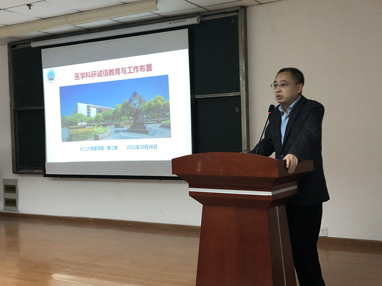 副部长黄江荣根据《关于开展医学科研诚信与作风建设专项教育整治活动的通知》(鄂卫通[2021]67号)文件精神,对国家、湖北省等出台相关文件进行解读,并分析相关科研诚信违规案例进行科研诚信教育,部署yl7703永利集团科研诚信教育活动,要求各系部认真学习文件,进行专题教研活动,按照时间节点保质保量完成任务。
