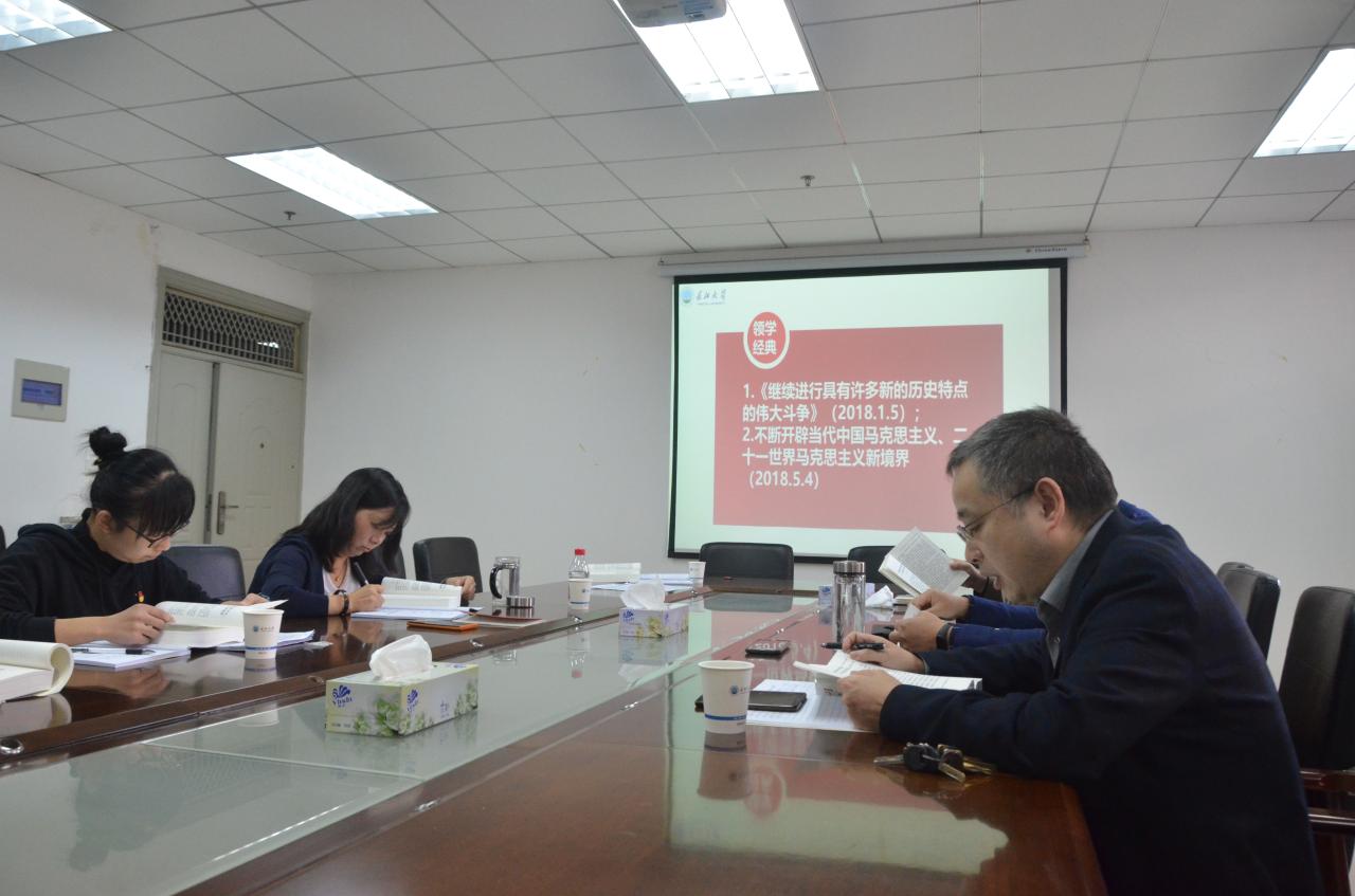 会上,全体中心组成员首先重温了入党誓词。在学习习近平新时代中国特色社会主义思想读书班“领读经典”环节中,张文君和黄江荣两位同志分别领学了《习近平谈治国理政》第三卷中的《继续进行具有许多新的历史特点的伟大斗争》和《不断开辟当代中国马克思主义、二十一世纪马克思主义新境界》两篇重要文献。在时政学习环节中,关辉同志专题重点解读了习近平在纪念中国人民抗日战争暨世界反法西斯战争胜利75周年座谈会上的讲话精神、习近平在全国抗击新冠肺炎疫情表彰大会上的讲话精神;陈晓光同志领学了习近平在教育文化卫生体育领域专家代表座谈会上的讲话精神。