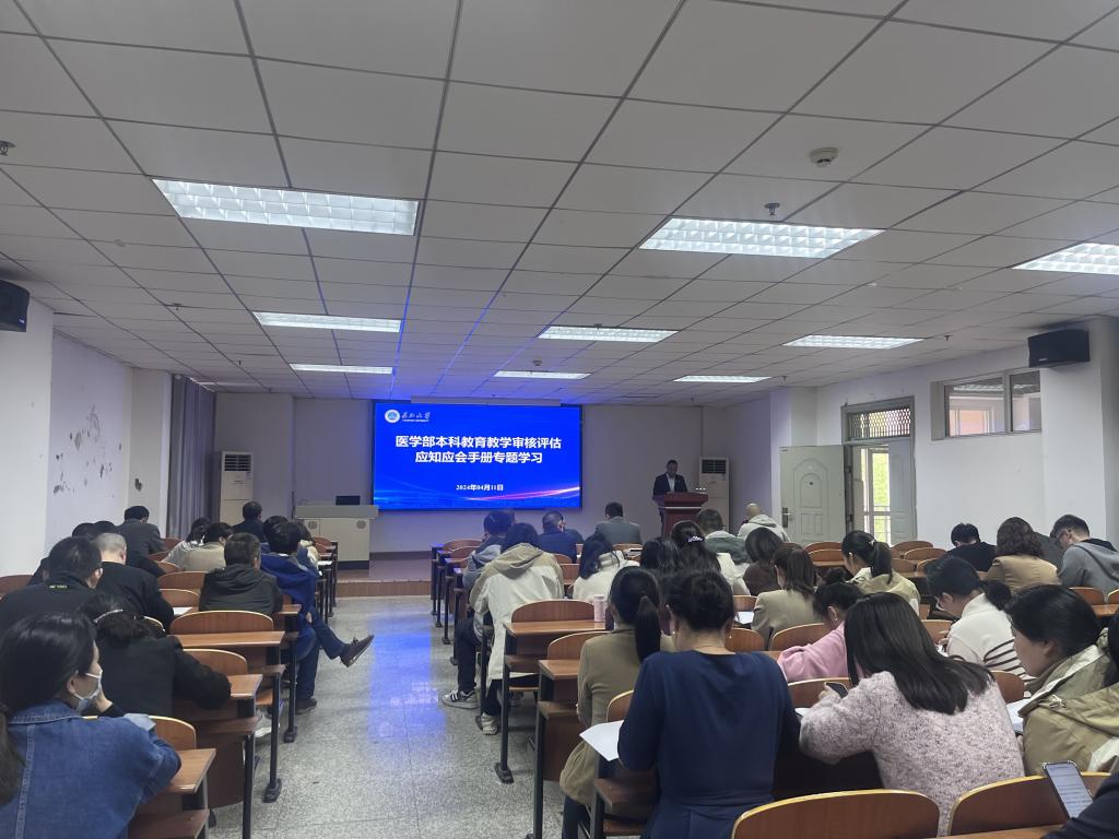 会上,健康医学院院长兼yl7703永利集团副部长陈晓光带领全体教职工一起开展了本科教育教学审核评估应知应会专题学习。教学办主任胡艳红讲解了评估工作中专家线上听课时教师需进行的教学准备工作。龚权部长强调,希望各位老师认真重视本次本科教育教学审核评估,高质量完成任务,为我校增光添彩。