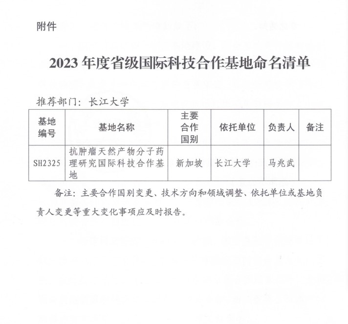 2024年1月,经湖北省科技厅批准,依托yl7703永利集团建设的省级国际科技合作基地“抗肿瘤天然产物分子药理研究国际科技合作基地”正式成立。